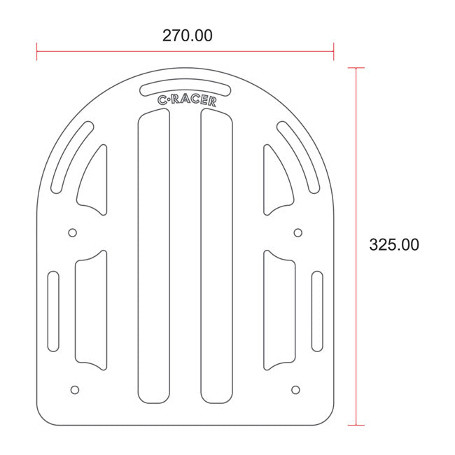 De C-Racer bagagerek No1 is een rek van geborsteld aluminium met vier bevestigingspunten, ontworpen voor aangepaste toepassingen. Het wordt geleverd met zwarte, gepoedercoate stalen beugels. Met een maximaal draagvermogen van 5 kg is het ideaal voor het vervoeren van kleine tassen of uitrusting.