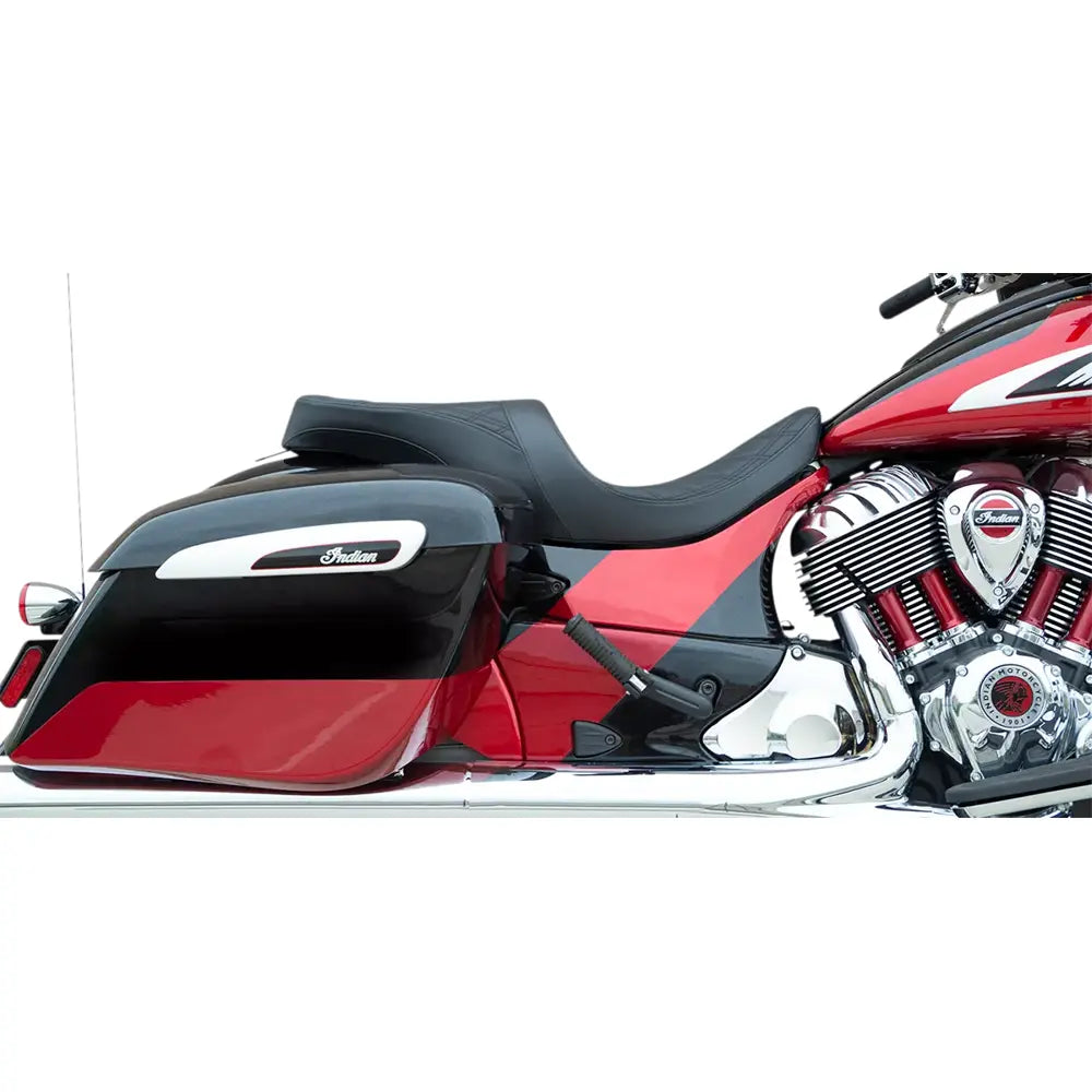 Wilt u dichter bij de bedieningselementen zitten zonder in te boeten aan comfort? Met de Drag Specialties Laag profiel Touring Voorste stoel zit u lager en meer naar voren dan bij de standaarduitvoering, waardoor u meer bereik hebt en een zelfverzekerde rijhouding kunt aannemen. Met stevige ondersteuning voor de bestuurder en een slank, strak ontwerp is deze stoel ontworpen voor zowel comfort als stijl op uw Indian.