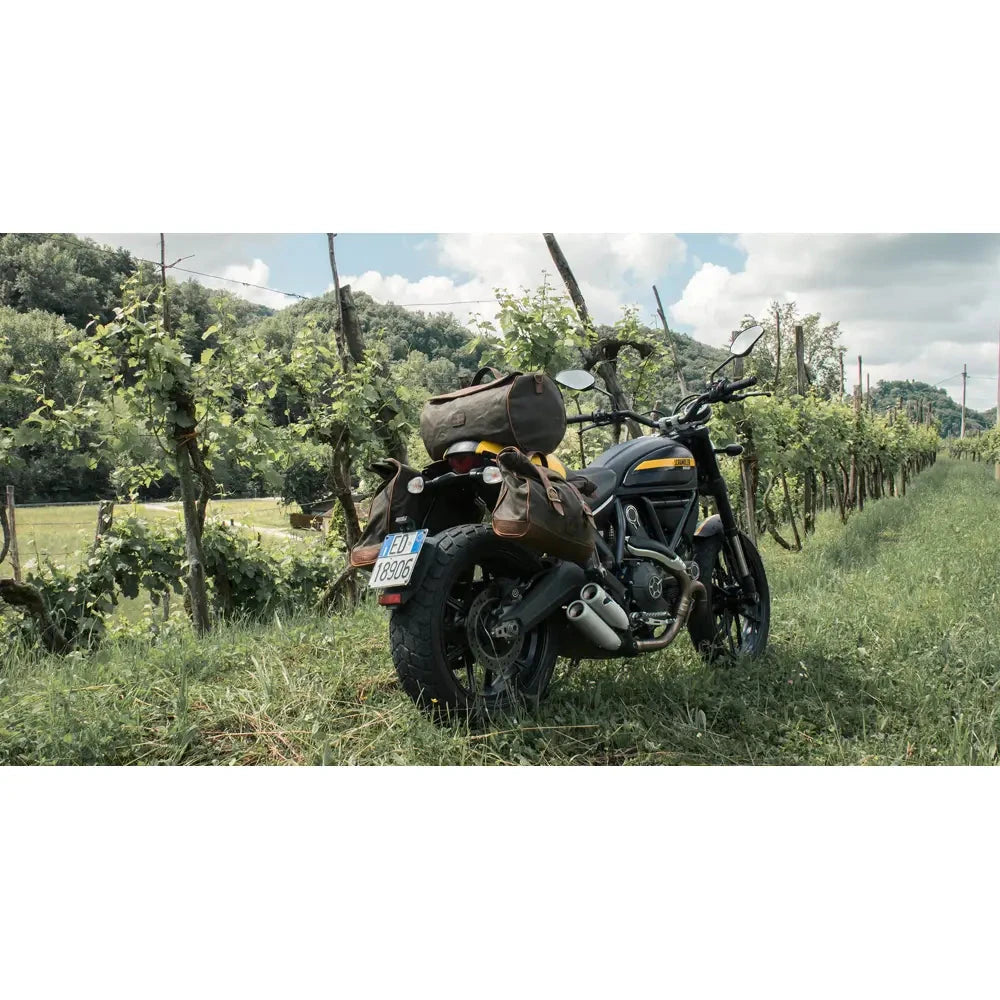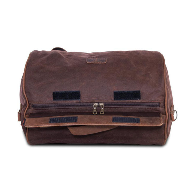 De Small Traveler Motorcycle Duffle Bag is een veelzijdige roltas van 17,5 liter, gemaakt van duurzaam gewaxt katoenen canvas met een polyester voering en details van geolied rangerleer. Perfect voor elke reis, kan aan de achterkant van je motor worden vastgemaakt of over je schouder worden gedragen. De tas wordt geleverd met een afneembare, verstelbare schouderriem en twee stevige elastische bevestigingsriemen voor een veilige bevestiging.