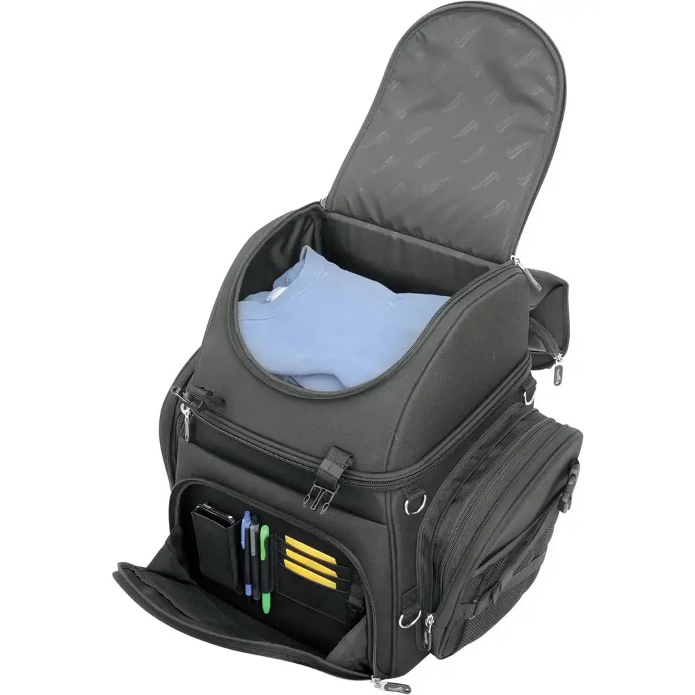 Deze tas is ontworpen om op verschillende manieren te worden bevestigd, of u hem nu aan de stoel, bagagerek of sissybar vastmaakt met de meegeleverde systemen. Hij behoudt zijn vorm dankzij een versterkte structuur en de combinatie van SaddleTuff™ en leerachtige panelen maakt hem bestand tegen de elementen. Met ruime compartimenten, uitbreidbare vakken en zelfs een laptopvak is hij geschikt voor zowel lange ritten als dagelijks gebruik.