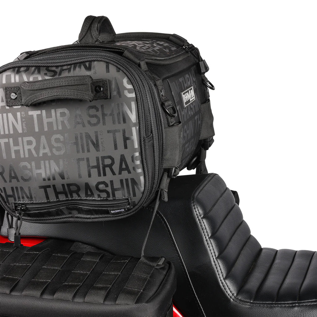 Met deze riemset kunt u eenvoudig extra uitrusting aan uw Thrashin-setup bevestigen. De plastic knevels worden door MOLLE-banden gevoerd voor een stevige bevestiging, en met de tegenoverliggende gespen kunt u de Passenger Bag rechtstreeks bevestigen zonder dat u een sissybar nodig hebt. De set kan ook worden gebruikt om andere tassen of bagage bovenop of langs de zijkanten van Thrashin-zadeltassen vast te zetten.